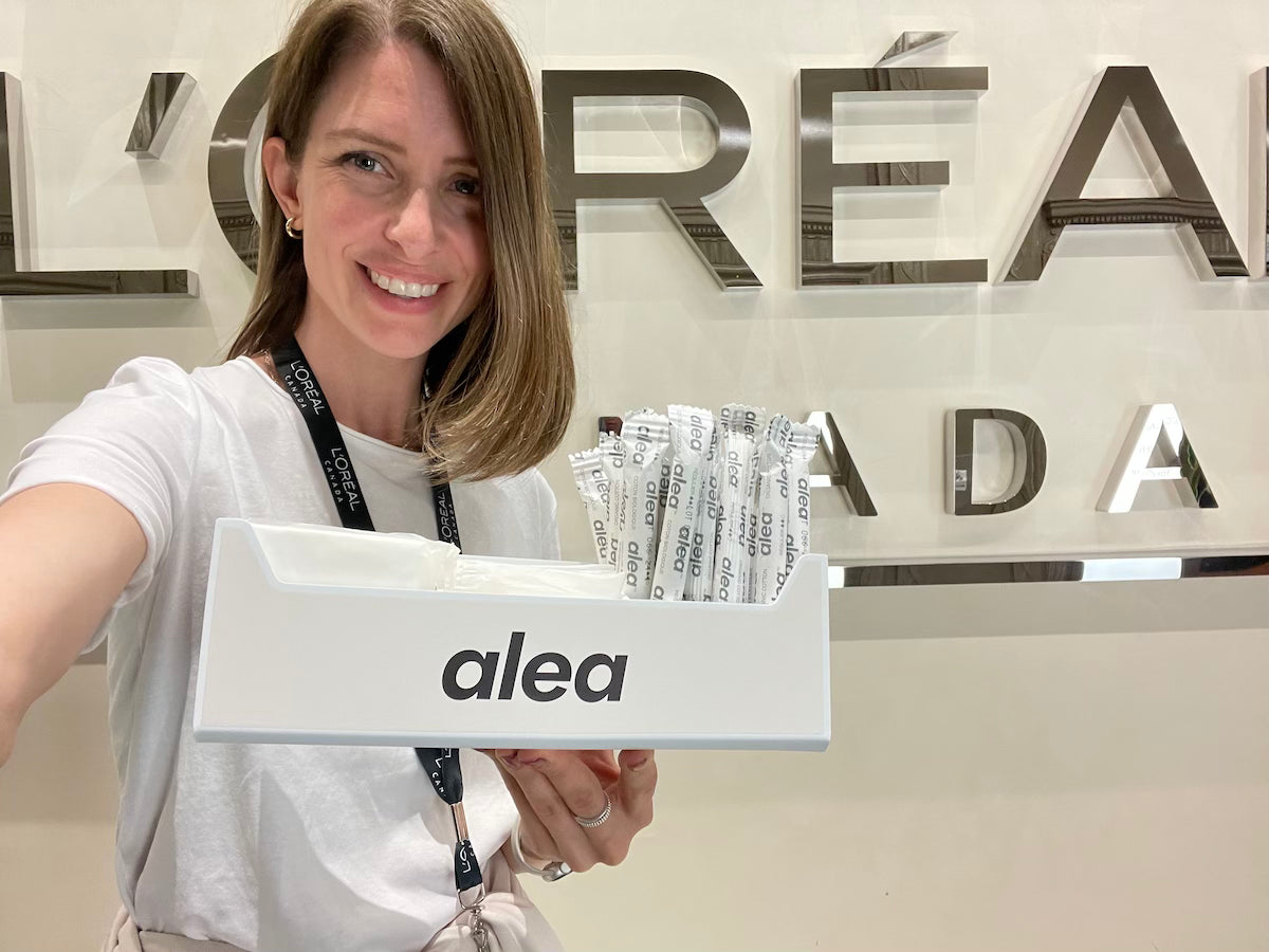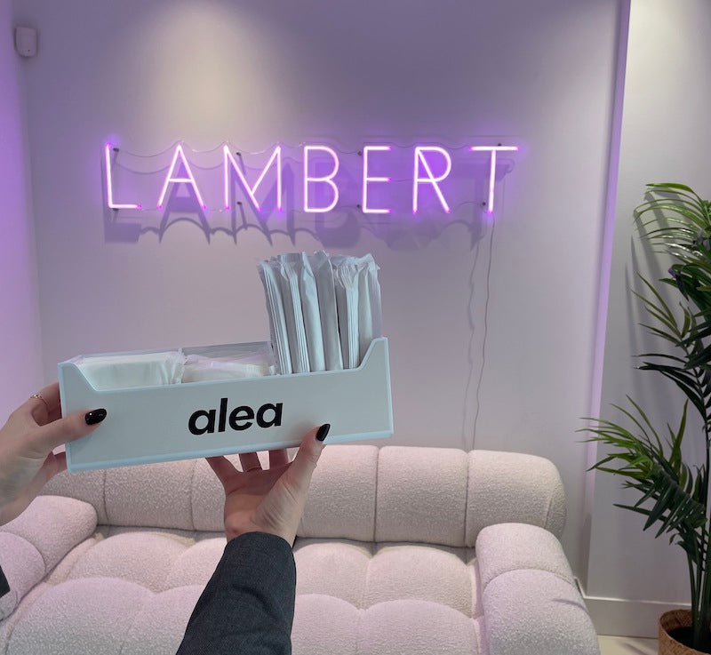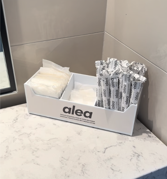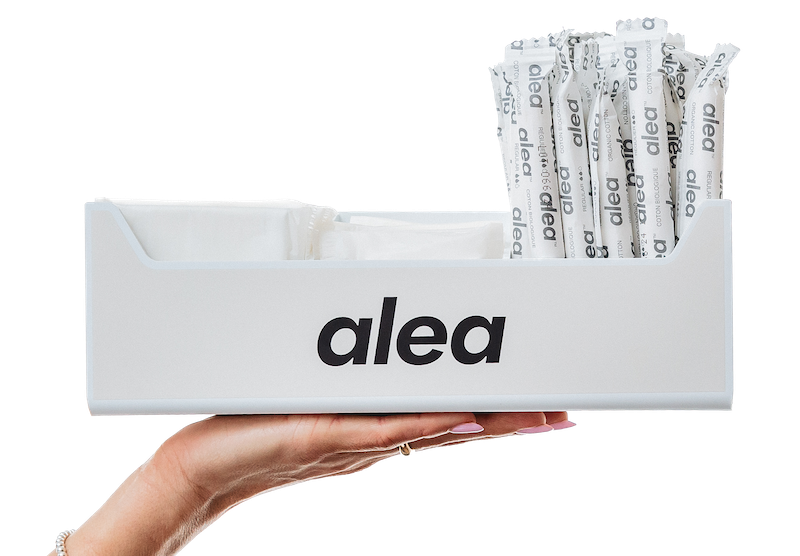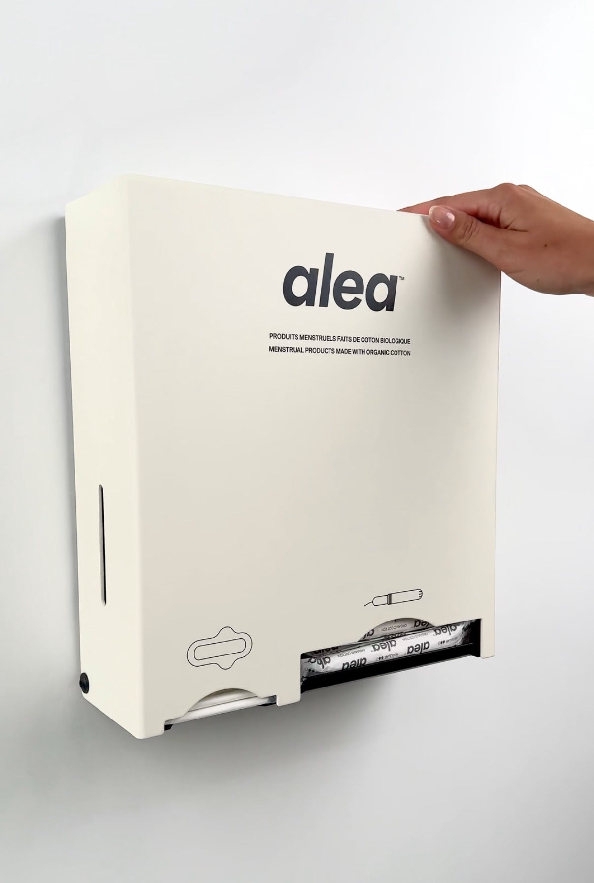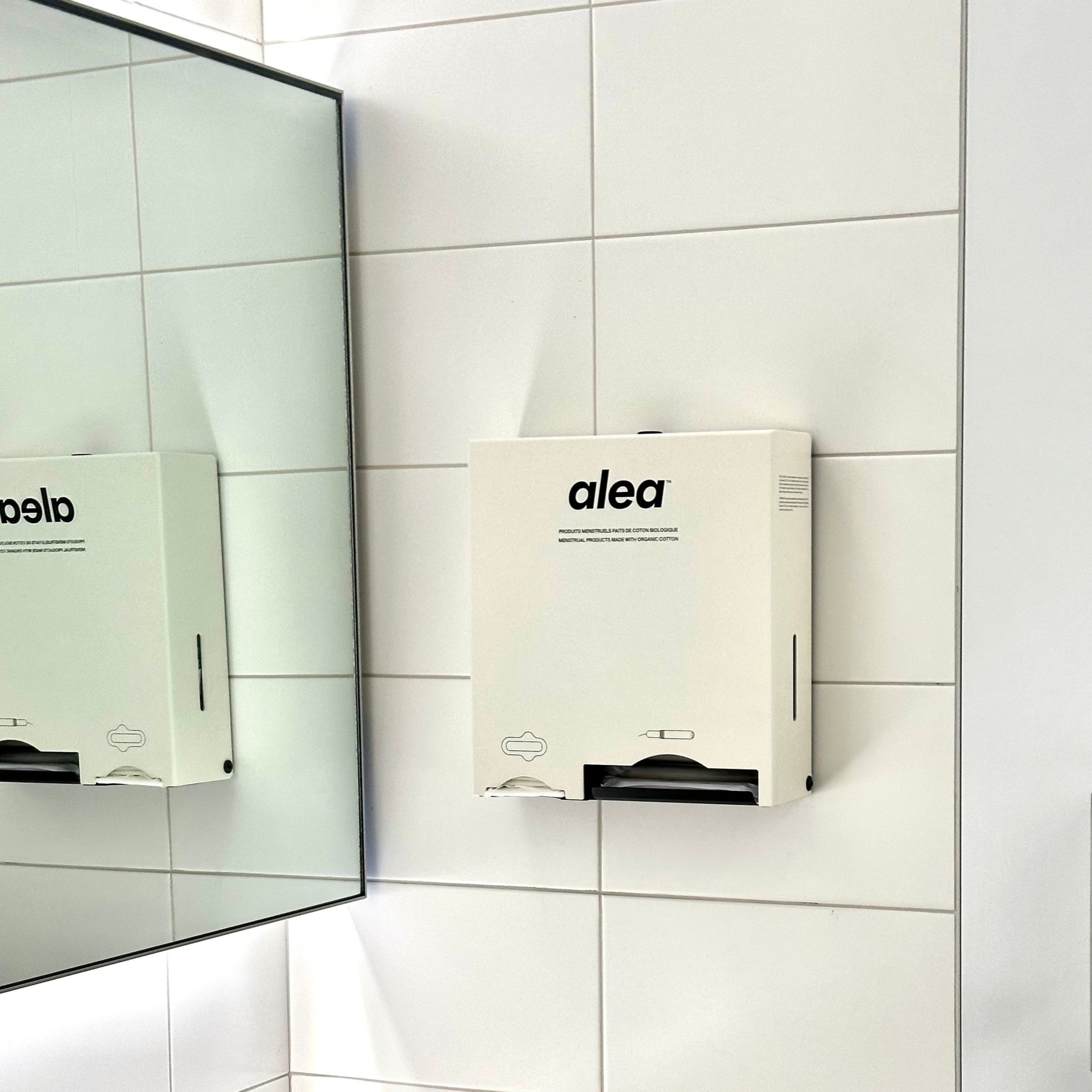 The Alea wall dispenser can hold up to 120 products, including 45 Alea day pads and 75 Alea tampons with applicators.